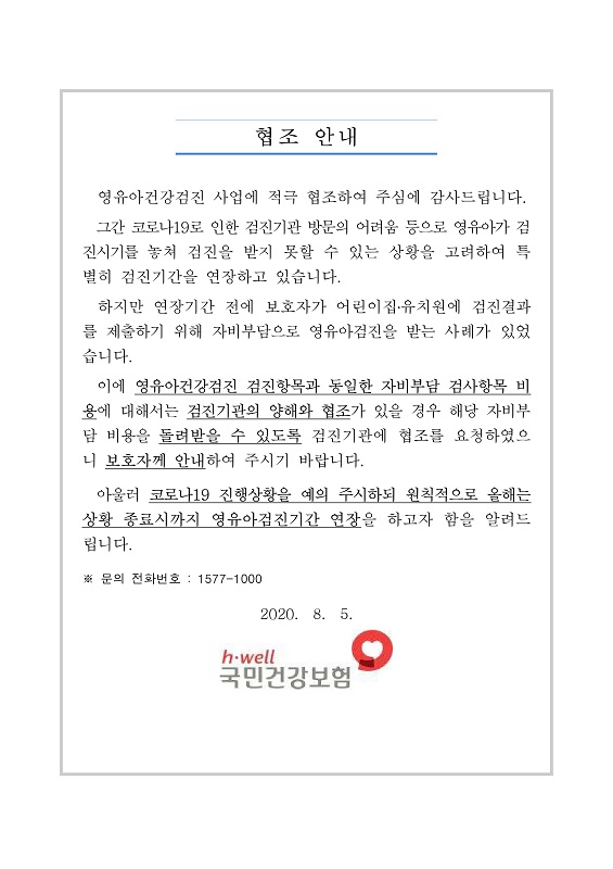 국민건강보험공단의 코로나19로 인한 영유아 건강검진(동일한 검사항목의 자비부담 건) 비용 환불 및 영유아 건강검진 미수검자의 검진기간 연장에 대해 다음과 같이 안내합니다.
